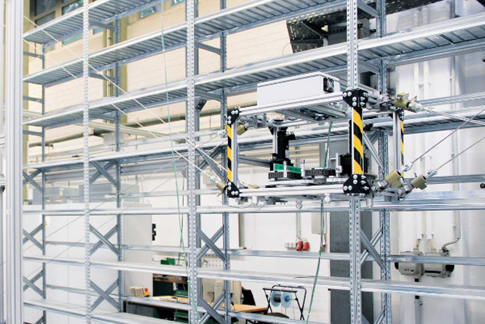 In the prototype of a cable-robot-based high-bay warehouse at the University