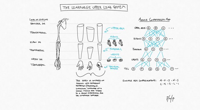 The LimbForge Upper Limb System is designed as modules for the upper arm, elbow, forearm, wrist, and hand, with options for different proportions and functionality. Each module is configured to an individual using LimbForge’s purpose-built software, then sent to a 3D printer to be fabricated in a plastic material in a range of skin tones.